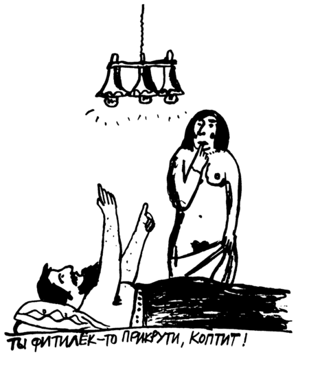 «Ты фитилек-то прикрути — коптит!» / Дмитрий Шагин / 2014 // Иллюстрация к книге «МИТЬКИ, описанные Владимиром Шинкаревым и нарисованные Александром Флоренским» / Александр Флоренский / 1990