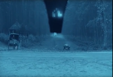 Один из них — это двойная экспозиция. В данном случае она помогает не только передать эмоции, но и сформировать пространство. Например, на кадр с дорогой накладывается особняк, к которому едет молодой изобретатель Эйнар Норсен. Без образа здания цель поездки персонажа не считывалась бы так точно. Также этот эффект помогает передать скорость и хаотичность движения. Кадры накладываются друг на друга во время быстрой езды молодого изобретателя.