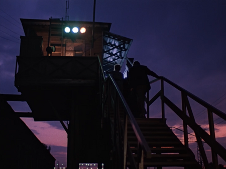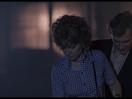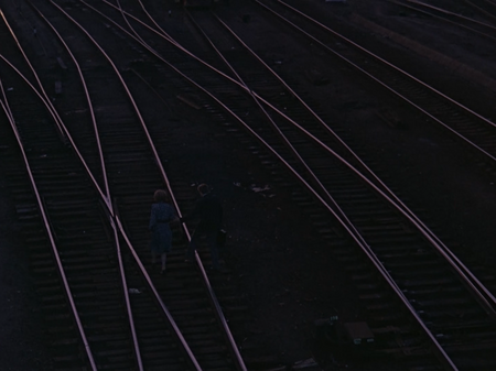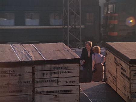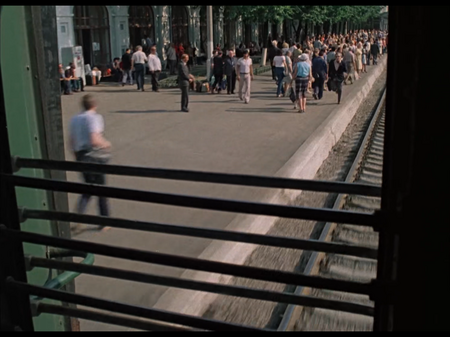 Когда Платон и Вера идут по перрону, появляется движение, которого раньше в фильма почти не было. Камера следует за ними плавно, свет становится естественным, в композиции появляется воздух. Эти кадры противопоставлены ригидности вокзала и очередей. Движение тут словно метафора живой внутренней свободы, которая появляется только между Верой и Платоном.