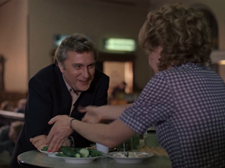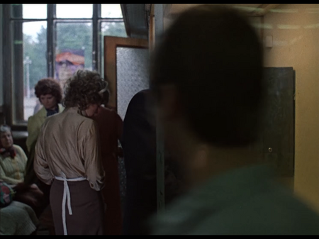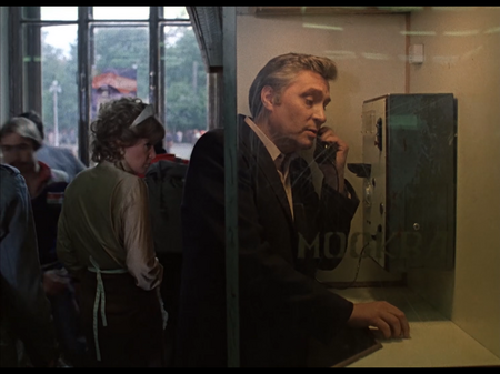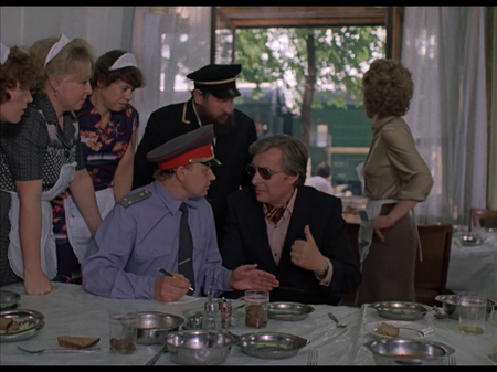 Несмотря на конфликтную ситуацию между героями, цвет кадра становится тёплым, ритм камеры замедляется, сцена длиннее. Бесконечно проходящие перед камерой люди создают ощущение, что герои — маленькие люди («маленький человек»), крупицы в системе, выполняющие свои роли пассажира и официантки. Только друг друга они видят «как человека». Вера искренне хочет помочь Платону, ведь чувствует себя виноватой в том, что он опоздал на поезд и его паспорт увезли. Герой впервые сталкивается с искренностью на этом вокзале, которая, на удивление, исходит от грубой «Мегеры».