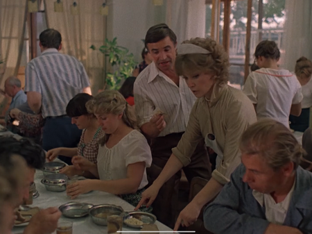 Сцена с буфетом очень динамична: официанты суетятся, посетители шумят, камера слегка покачивается. Создаётся ощущение беспорядочного, но всё равно лишённого внутренней жизни пространства. Здесь и происходит первая встреча героев. В месте, где не предполагается ничего, кроме обслуживания и движения по расписанию. Вера лишь обслуживающий персонал, Платон её клиент, который не ел ничего, а поэтому отказывается платить, вызывая возмущение героини. Героя вынуждают платить, потому что так заведено, так нужно. Из-за этого конфликта Платон пропускает свой поезд, где у него остаются чемоданы и билет.