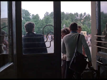 Платону нужно уезжать. И снова появляются кадры толпы, каких-то вещей. На этом фоне герои почти незаметны, но на следующем кадре они оказываются практически в центре композиции и всё внимание всё равно концентрируется на них двоих. Именно любовь выделяет их из безличной массы.