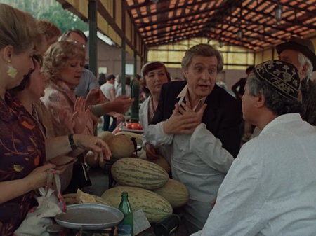 Кадры с продажей дынь очень шумные: много людей, разговоров, криков и конфликтов. Хотя сами герои статичны.