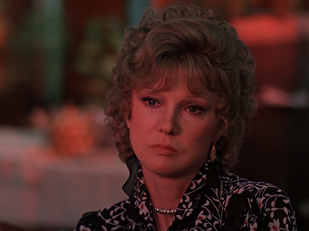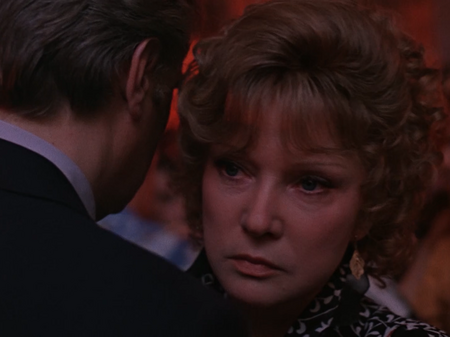 Красный цвет тут уже играет по-другому. Он не ощущается агрессивным, скорее тоскливым. Крупный план делает акцент на эмоциях героев, которые хотят быть вместе, но не подходят друг другу по своим социальным ролям: он интеллигент, она простая привокзальная официантка.