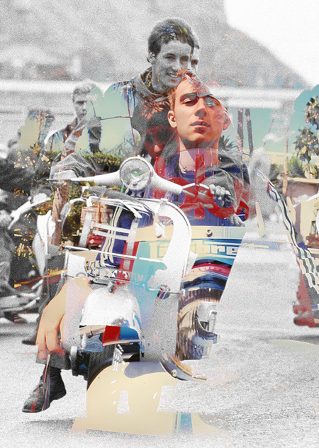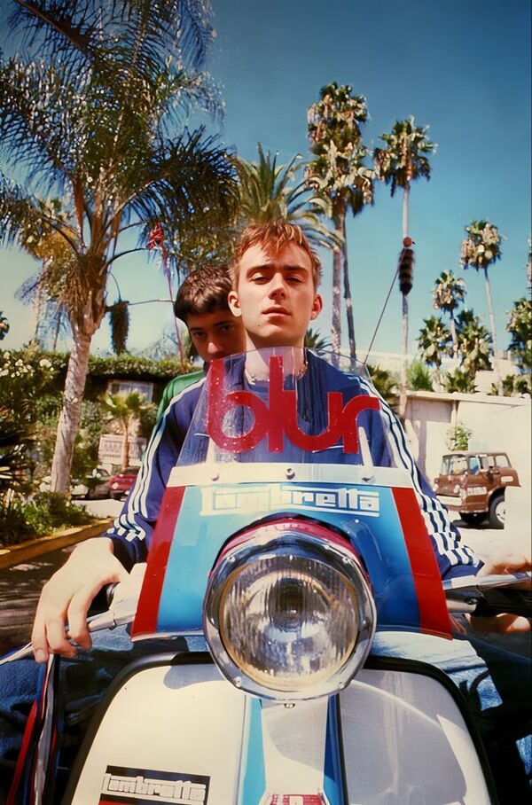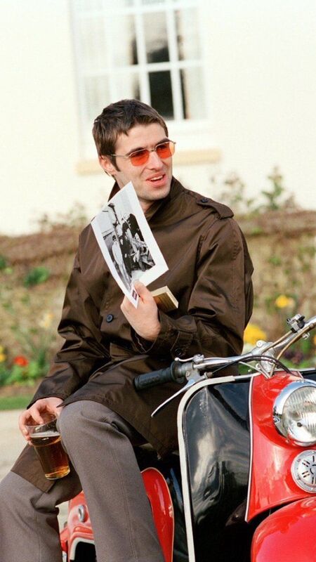 Лиам Галлахер на скутере на съемках для обложки альбома 'Be here now', 1997 г.; Дэймон Албарн и Грэм Коксон на скутере Lambretta с названием группы, 1994 г.