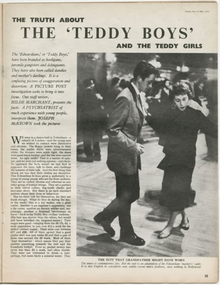 Статья в журнале Picture Post 1954 г. «Правда о тедди-боях и тедди-герл»; Группа тедди-боев в Саут-Вестерн-Корт, 1956 г.