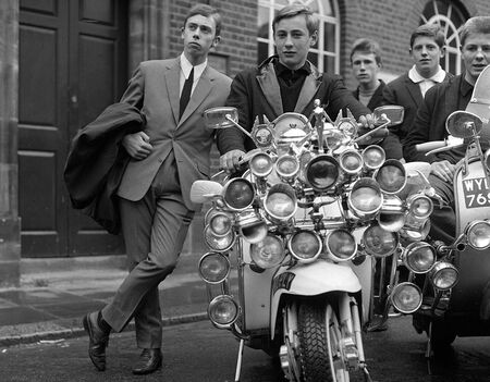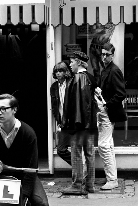 Группа модов у магазина одежды Джона Стивена. На них туфли Clarks, клетчатые брюки, кожаные куртки и пиджаки, 1960-е; Моды у скутера, 1960-е гг.