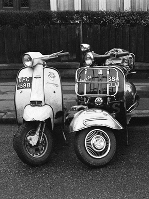 Оттюннингованный скутер, 1960-е; Мотороллеры Vespa, Лондон, 1964 г.