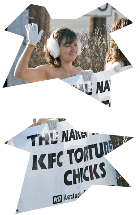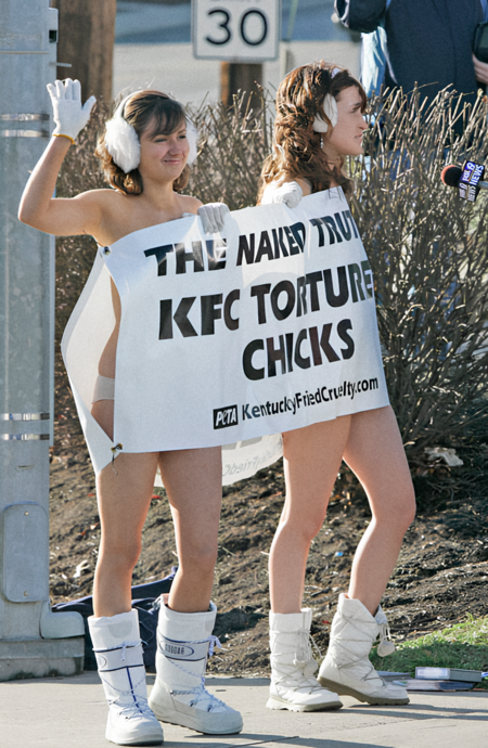 Участницы PETA Линдси Райт (слева) и Николь Мэтьюз (справа) дают интервью возле ресторана KFC, плакат «Голая правда: KFC пытает цыпочек» в рамках рекламной кампании «KFC Scalds Chicks Цинциннати, 2007. — URL: https://s.hdnux.com/photos/01/36/41/387163/4/rawImage.jpg (дата обращения: 10.11.2025).