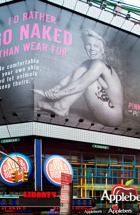 Баннер с участием певицы Pink в рамках рекламной кампании «I’d Rather Go Naked Than Wear Fur» («Лучше я буду голой, чем в мехе»), Таймс-сквер, США, 2015