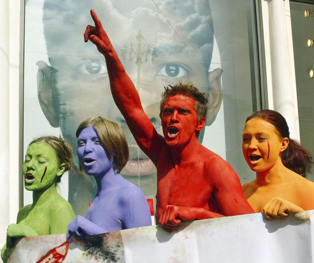 Протест у магазина Benetton, Москва, 2005 / кампания PETA во время конференции по птичьему гриппу в Нуса Дуа, Бали, Индонезия, 2008 / PETA перед посольством Великобритании в Берне, Швейцария, 2006
