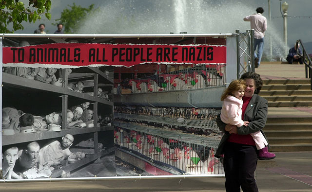 Экспозиция PETA, баннер «В течение 7 лет, 12 миллионов людей погибли в Холокосте. Такое же количество животных убивают каждый час в Европе, чтобы съесть», парк Сан-Диего Бальбоа, Калифорния, 2003