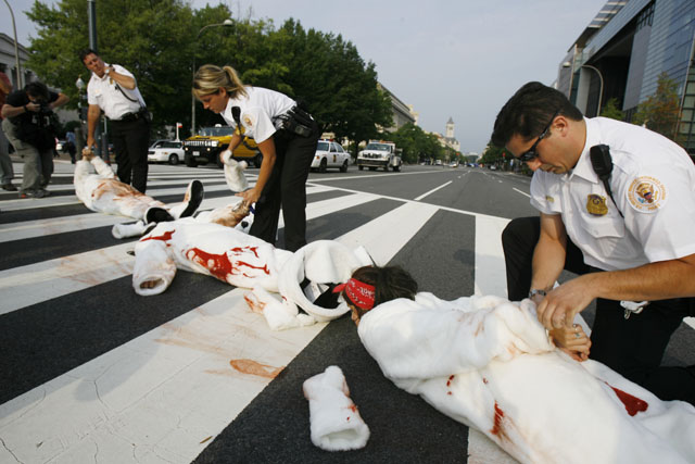 Арест активистов PETA после того, как они перекрыли движение перед посольством Канады, Вашингтон, США, 2009