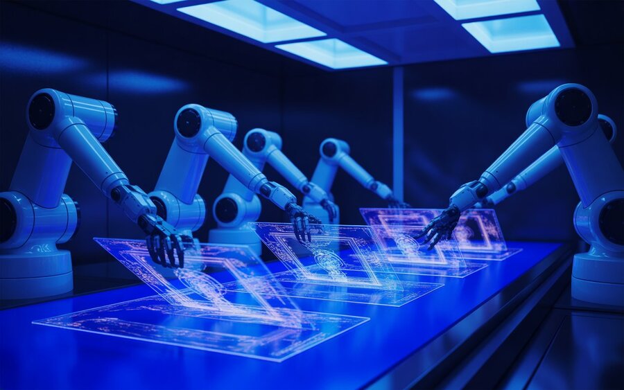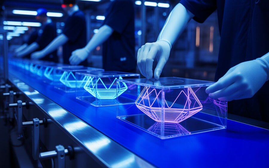 Промпт: Generate a production line with a conveyor belt. Artificial hands assemble holograms and package them. Futuristic and realistic style.