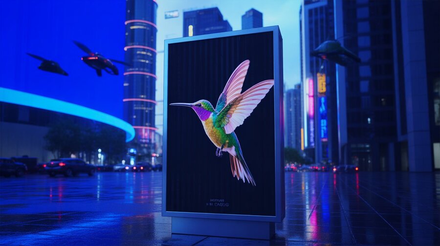 Промпт: Vertical poster outdoor mockup in a futuristic city. Realistic style.