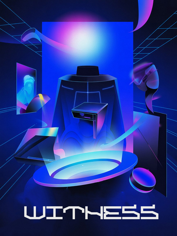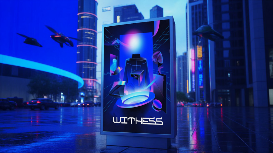 Промпт: An illustrated advertising poster for a brand producing holograms. The poster should feature the inscription «Witness.» Futuristic colors: purple and blue. Futuristic style.