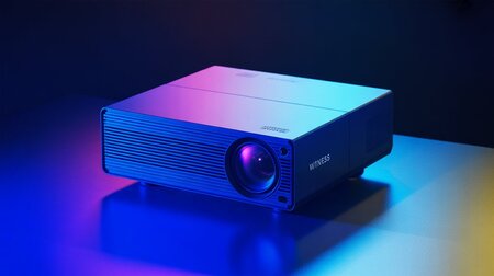 Промпт: A photograph of a closed projector box against a dark background. Lots of gradients and highlights. Futuristic purple and blue colors. The brand name on the packaging is «Witness».
