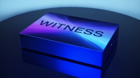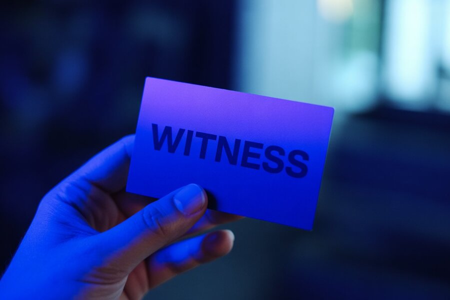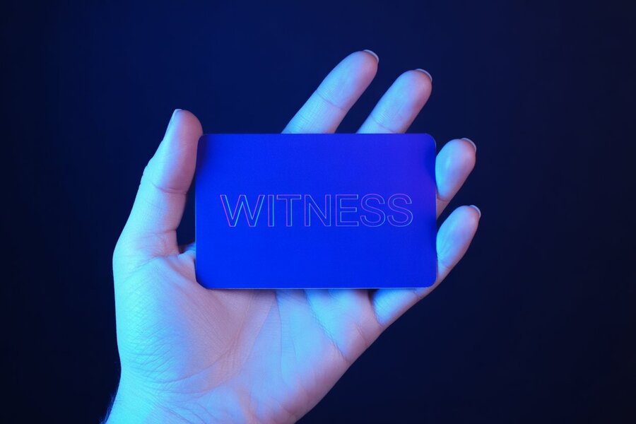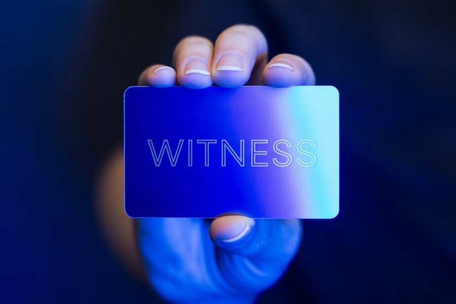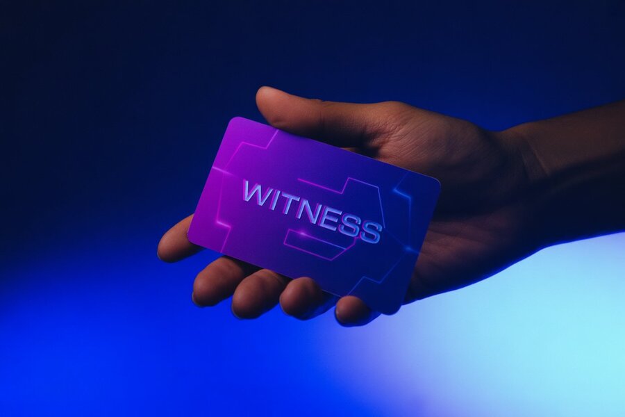 Промпт: Photo of a business card in hand, dark background. The card reads «Witness.» Purple and blue colors, futuristic style.