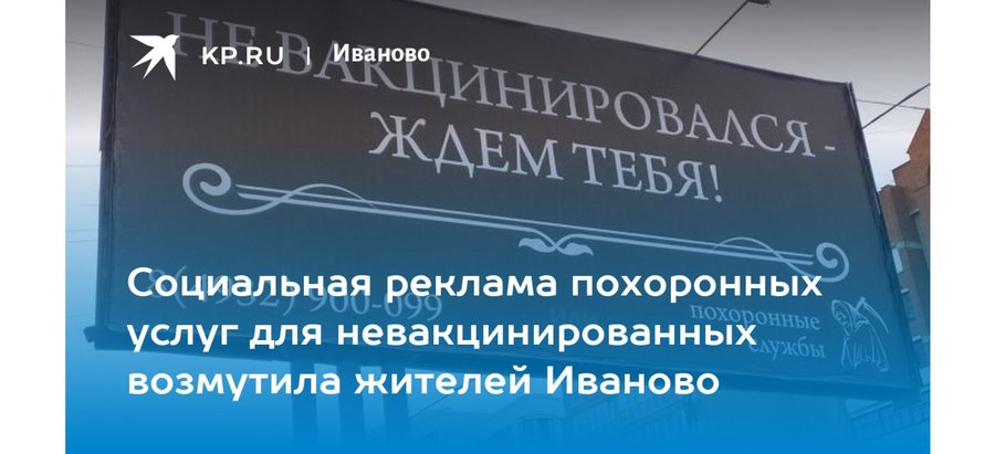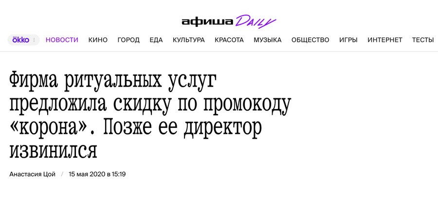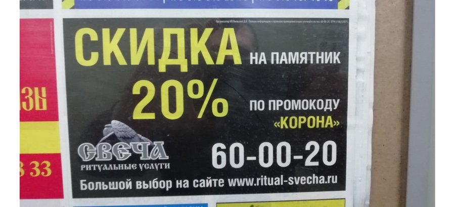 «Смоленская фирма ритуальных услуг „Свеча“ напечатала и развесила по городу объявления, в которых предлагается скидка 20% на памятники по промокоду „корона“. Многие пользователи социальных сетей посчитали такую рекламу неуместной. „Коронавирус бушует, кто‑то умирает, а кто‑то деньги делает. Это реально перебор“, — написала одна из комментаторок. Однако некоторые не увидели в объявлении ничего плохого: „Каждый зарабатывает так, как может. Это нормально“.