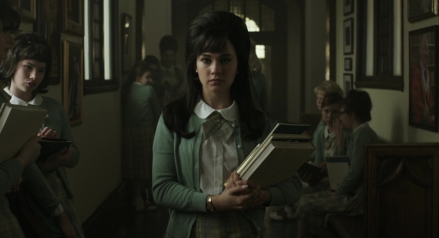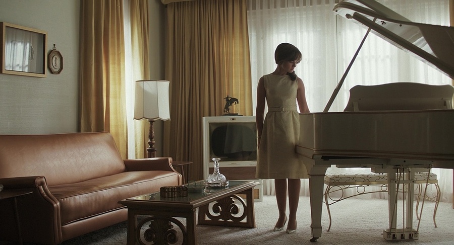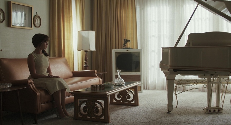 Сравнивая эти два похожих по композиции, цвету и свету кадра, можно увидеть как поменялась Присцилла с Элвисом. Ее образ, холодный взгляд, походка. Однако она все еще одинокая, чуждая миру, и мир ей чужден.