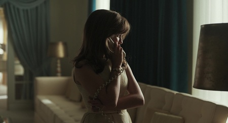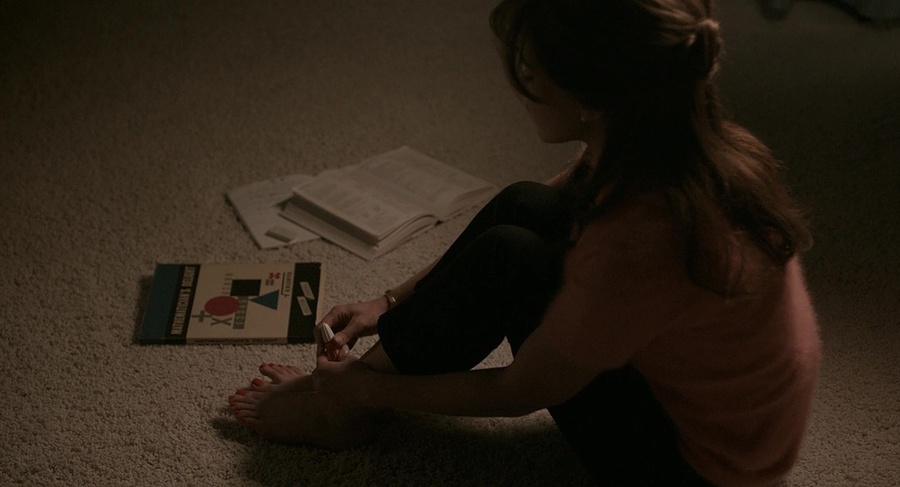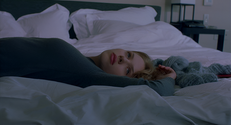 Здесь оба героя лежат в одиночестве на кровати с совершенно пустым взглядом. В кадрах приглушенный свет и пастельные холодные тона, создающие атмосферу изолированности, отчуждения и одиночества. Герои как бы «застыли».