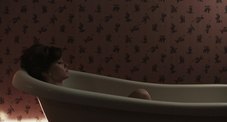 Героиня снова в центре, ванна обрамляет ее, служит «капсулой», создает ощущение заключенности. Взгляд «в пустоту» полон отрешенности. Нужно также обратить внимание на цвет и свет: все сливается в единый блеклый «неживой» фон.