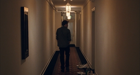 Коридоры отеля сжимают, сковывают, создают ощущение клаустрофобии и неуюта. Опять же, снова рамки, перспектива, холодные оттенки и долгие, статичные сцены.