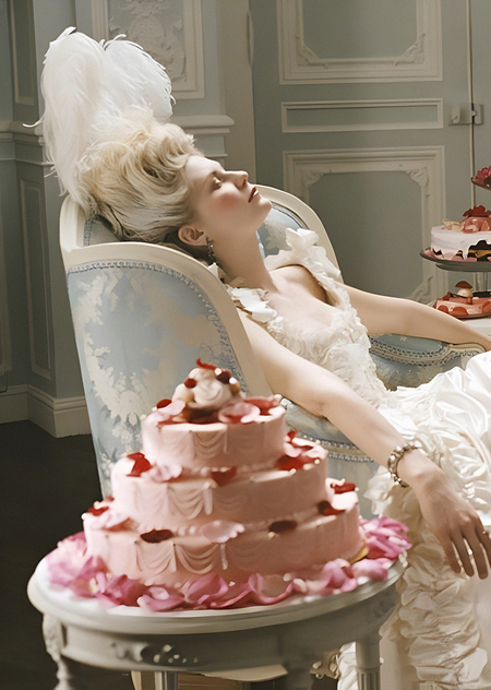 Фильм «Мария-Антуанетта» словно рассказывает историю подростка, которого заперли во дворце и заставили подчиняться строгим правилам. Этот «скучающий подросток» находит свое утешение в мире роскоши, пиршеств и излишеств. Именно так проявляется одиночество и дистанцированность героини Копполы. Эти сцены не являются чем-то гламурным, эстетизированном, они наоборот скорее отталкивают зрителя своей избыточностью и призваны показать, что героиня отчуждена от самой себя.