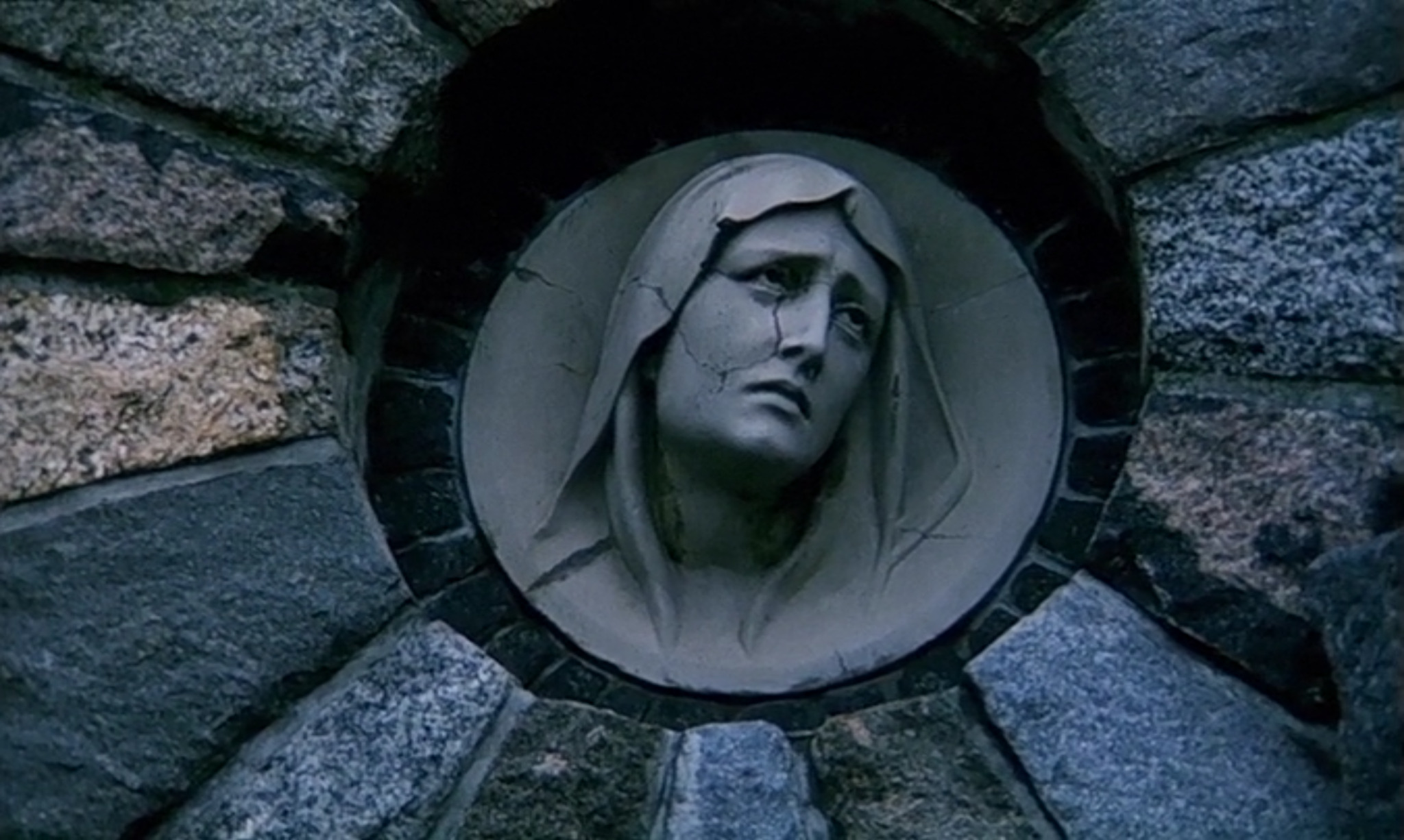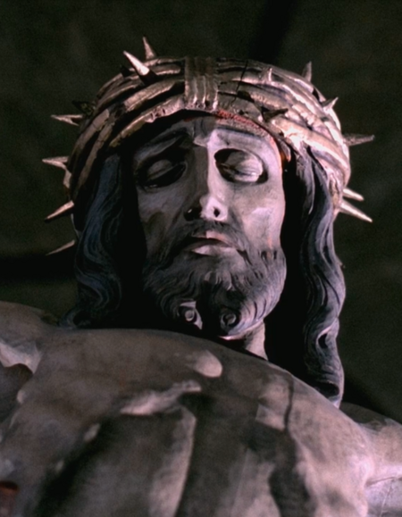 Будто бы в последней попытке вернуться к своей прошлой нормальной жизни Анна снова обращается к своей вере. Фигура Христа занимает собой весь кадр, он возвышается над Анной. Она будто бы пытается заглянуть в его глаза, при этом ее поза и наклон головы полностью отзеркаливает положение деревянной статуи.