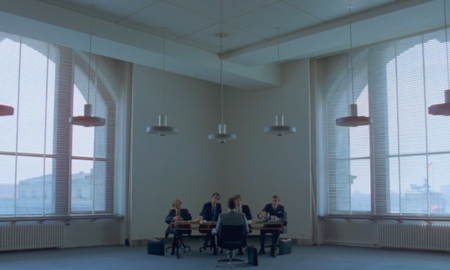 Он статичен, в кадре движутся только актеры, они почти никак не взаимодействуют с окружением. Все это больше похоже на театральные декорации, «задник» на сцене, что довольно специфично для арт-хауса [2]. Светом же зачастую выделяются герои, сразу же привлекая внимание зрителя.