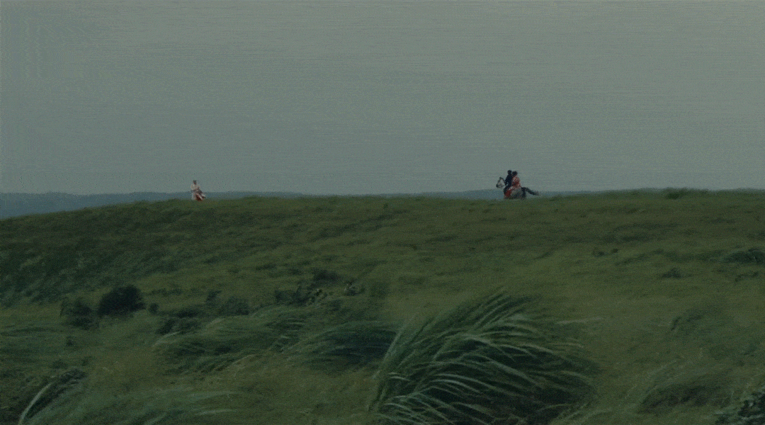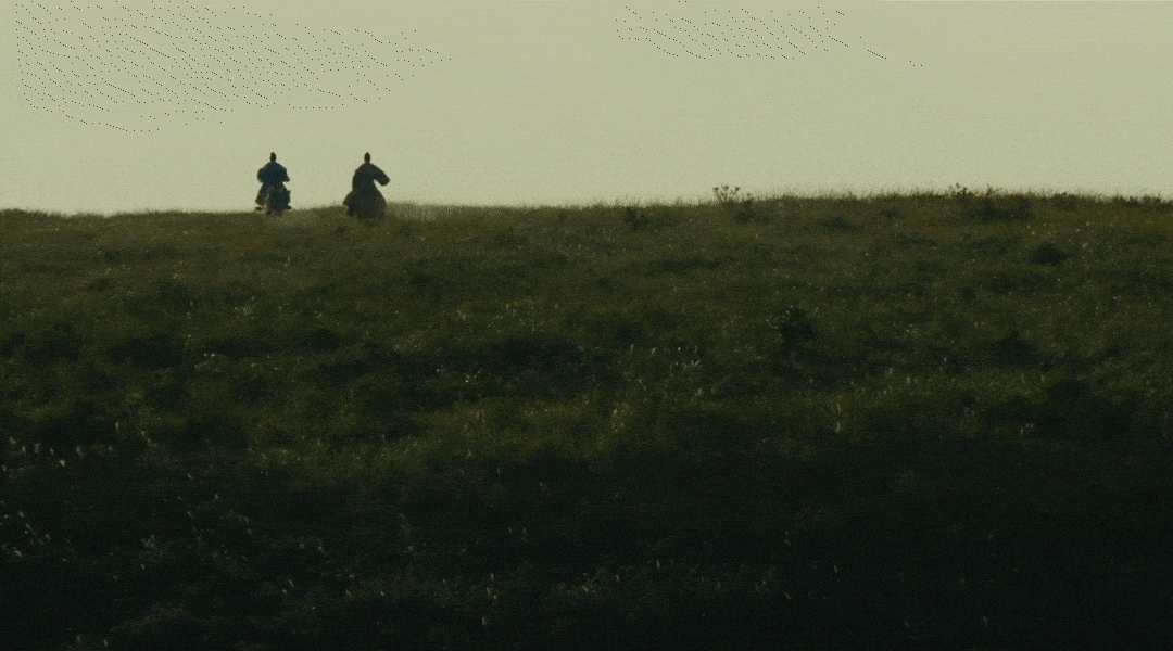 Он замирает, когда персонажи в засаде, и наполняется ветром, который приводит траву в поле в хаотичное движение. Это действие дублируется конными солдатами, появляющимися из-за холма.