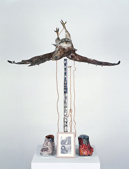 Пол Тек (1933–1988), «Без названия (Канюк)», 1968. Дерево, чучело канюка, обувь, краска, металл, черно-белые фотографии, бечёвка, оргстекло и воск, 51 3/16 × 42 1/8 × 19 11/16 дюйма (130 × 107 × 50 см