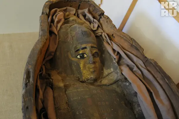 Слева: фотофиксация мумии в погребальной маске, Пермская художественная галерея (фото: Комсомольская правда)