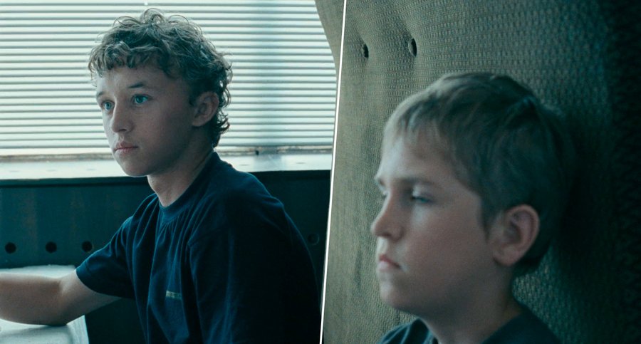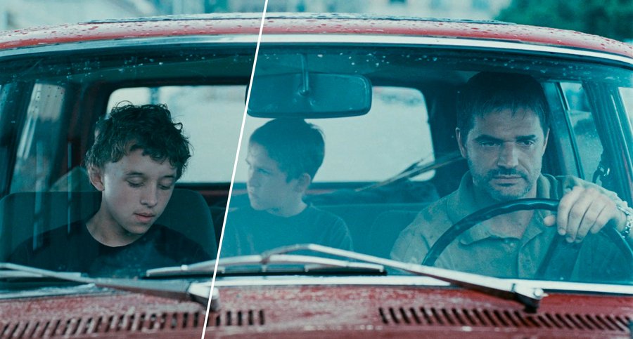 Фильм построен на умышленном нарушении равновесия. Отец почти всегда доминирует в кадре: он крупнее, находится выше, на переднем плане. Например, сцена в машине: отец за рулем, его фигура массивна и занимает значительную долю пространства. Этот визуальный дисбаланс — прямая метафора власти отца и эмоционального напряжения между персонажами.