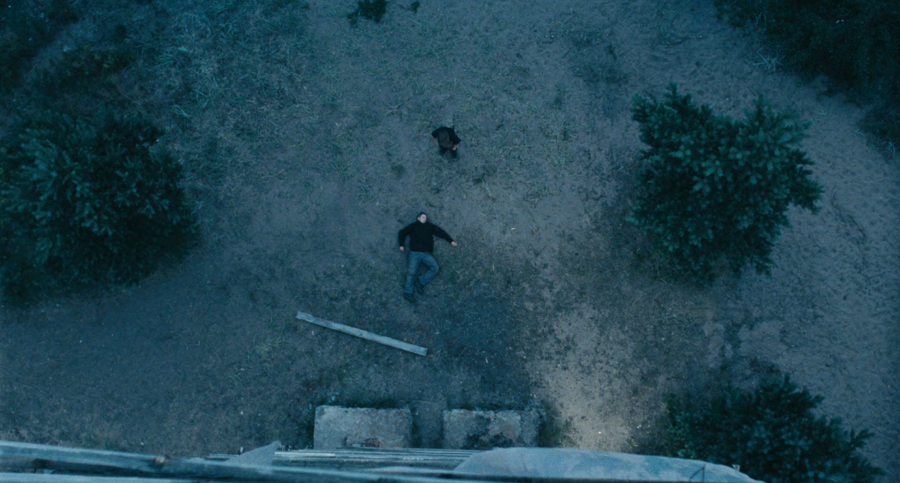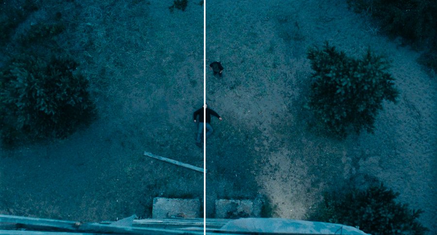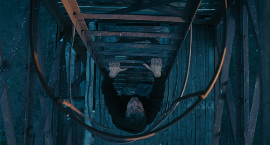 Кадр, в котором персонаж поднимается по лестнице вышки симметричен. Это момент нельзя назвать бытовым, он один из самых важных и сакральных. Такой же центрированный кадр — мертвое тело отца, лежащее на берегу. Композиция перестает быть динамичной, становится статичной и лишенной жизни.